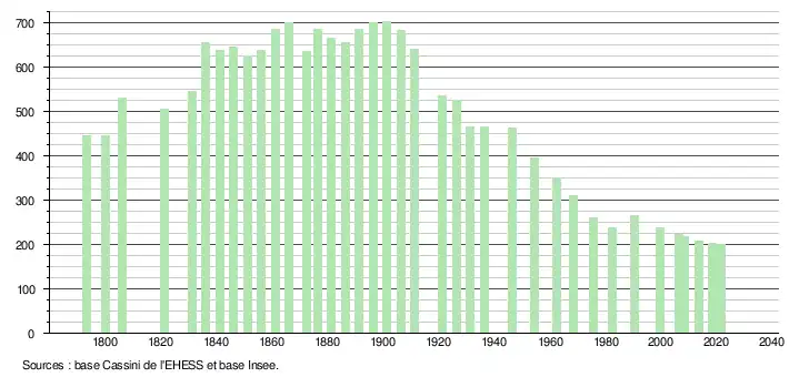 L'évolution du nombre d'habitants est connue à travers les recensements de la population effectués dans la commune depuis 1793. Pour les communes de moins de 10 000 habitants, une enquête de recensement portant sur toute la population est réalisée tous les cinq ans, les populations légales des années intermédiaires étant quant à elles estimées par interpolation ou extrapolation[26]. Pour la commune, le premier recensement exhaustif entrant dans le cadre du nouveau dispositif a été réalisé en 2008[27].