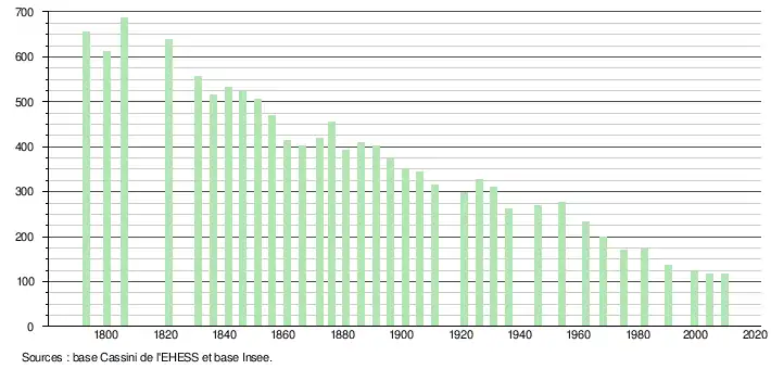 L'évolution du nombre d'habitants est connue à travers les recensements de la population effectués dans la commune depuis 1793. À partir du , les populations légales des communes sont publiées annuellement dans le cadre d'un recensement qui repose désormais sur une collecte d'information annuelle, concernant successivement tous les territoires communaux au cours d'une période de cinq ans. Pour les communes de moins de 10 000 habitants, une enquête de recensement portant sur toute la population est réalisée tous les cinq ans, les populations légales des années intermédiaires étant quant à elles estimées par interpolation ou extrapolation[17]. Pour la commune, le premier recensement exhaustif entrant dans le cadre du nouveau dispositif a été réalisé en 2004[18],[Note 2].
