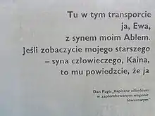Au mémorial de Yad Vashem, un wagon rappelle la mémoire des millions de juifs parqués dans des wagons expédiés à travers toute l'Europe vers les camps d'extermination. Devant ce wagon est gravée, en anglais et en hébreu, une inscription de Dan Pagis : « Ici dans ce wagon plombé, moi, Ève avec mon fils Abel. Si vous voyez mon fils aîné, Caïn fils de l'Homme, dites-lui que je »