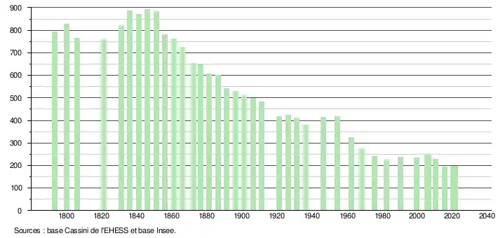 L'évolution du nombre d'habitants est connue à travers les recensements de la population effectués dans la commune depuis 1793. Pour les communes de moins de 10 000 habitants, une enquête de recensement portant sur toute la population est réalisée tous les cinq ans, les populations légales des années intermédiaires étant quant à elles estimées par interpolation ou extrapolation[14]. Pour la commune, le premier recensement exhaustif entrant dans le cadre du nouveau dispositif a été réalisé en 2005[15].