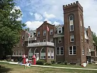 L'école populaire de Danebod (Danebod Folk School) est édifiée en 1888. Elle est détruite dans un incendie le et reconstruite neuf mois plus tard. Elle forme un bâtiment de brique de trois étages, ses gables sont portés par des parapets. La tour en angle à créneaux de quatre étage et les arches de son entrée rappellent l'architecture gothique danoise[48]. Rénovée en 1946, l'ancienne école est utilisée pour les camps et retraites de l'église luthérienne ainsi que certaines réunions publiques. Ses éléments intéressants incluent le podium sculpté de la salle de lecture, les statues de la salle de lecture et des salons ainsi que le podium de la salle à manger[34].