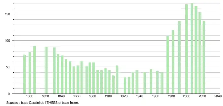 L'évolution du nombre d'habitants est connue à travers les recensements de la population effectués dans la commune depuis 1793. Pour les communes de moins de 10 000 habitants, une enquête de recensement portant sur toute la population est réalisée tous les cinq ans, les populations légales des années intermédiaires étant quant à elles estimées par interpolation ou extrapolation[18]. Pour la commune, le premier recensement exhaustif entrant dans le cadre du nouveau dispositif a été réalisé en 2006[19].