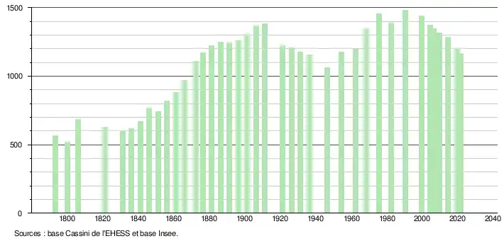 L'évolution du nombre d'habitants est connue à travers les recensements de la population effectués dans la commune depuis 1793. Pour les communes de moins de 10 000 habitants, une enquête de recensement portant sur toute la population est réalisée tous les cinq ans, les populations légales des années intermédiaires étant quant à elles estimées par interpolation ou extrapolation[30]. Pour la commune, le premier recensement exhaustif entrant dans le cadre du nouveau dispositif a été réalisé en 2004[31].