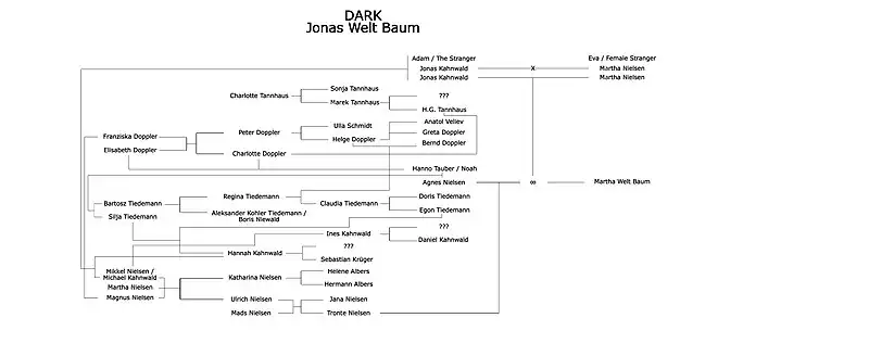 • Agnes Nielsen : la grand-mère d’Ulrich, fille de Bartosz et Silja, sœur de Noah, petite fille d'Hannah, Egon, Regina et Aleksander, nièce de Jonas et Claudia et en même temps arrière-petite-fille de Claudia, mère de Tronte (à la suite de sa relation avec l'Origine), tante de Charlotte Doppler, amante de Doris Tiedemann en 1953