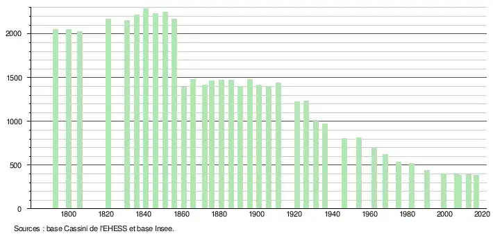 L'évolution du nombre d'habitants est connue à travers les recensements de la population effectués dans la commune depuis 1793. Pour les communes de moins de 10 000 habitants, une enquête de recensement portant sur toute la population est réalisée tous les cinq ans, les populations légales des années intermédiaires étant quant à elles estimées par interpolation ou extrapolation[8]. Pour la commune, le premier recensement exhaustif entrant dans le cadre du nouveau dispositif a été réalisé en 2007[9].