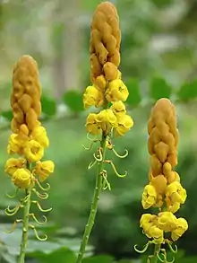 Les fleurs sont grandes, en longs épis jaune-orangé. L'inflorescence ressemble à une bougie jaune d'où son surnom d'arbre candélabre.
