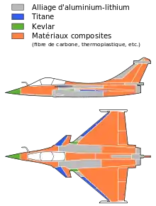 L'avion est à aile delta et plans canard, à commandes de vol électriques et utilise des éléments de furtivité passifs et actifs[13] ; il est équipé d'un radar à balayage électronique RBE2 et de deux moteurs Snecma M88. Pour la supériorité aérienne, il utilise des missiles air-air et un canon. En bombardement tactique, il utilise des bombes guidées laser, des missiles de croisière, des missiles antinavires et, en bombardement stratégique, un missile nucléaire ASMP-A.