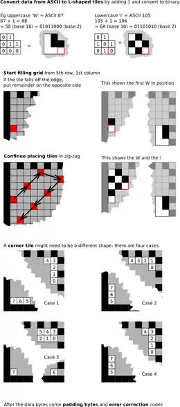 Exemple de code DataMatrix, représentant le texte "Wikipedia" coloré pour montrer données (vert), remplissage (jaune), correction d'erreur (rouge), repères et timing (magenta) et inutilisation (orange).