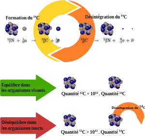 La datation au carbone 14 se fonde ainsi sur la présence dans tout organisme de radiocarbone en infime proportion (de l'ordre de 10−12 pour le rapport 14C/Ctotal). À partir de l'instant où un organisme meurt, la quantité de radiocarbone qu'il contient ainsi que son activité radiologique décroissent au cours du temps selon une loi exponentielle. Un échantillon de matière organique issu de cet organisme peut donc être daté en mesurant soit le rapport 14C/Ctotal avec un spectromètre de masse, soit son activité X années après la mort de l'organisme.