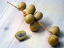 - rutab (semaines 26 à 28, environ) : perte supplémentaire d'humidité (qui se réduit à environ 35 %) et, chez certains cultivars, transformation du saccharose en sucre inverti, brunissement et ramollissement de la peau. C'est la période pendant laquelle les dattes fraîches sont commercialisées ;