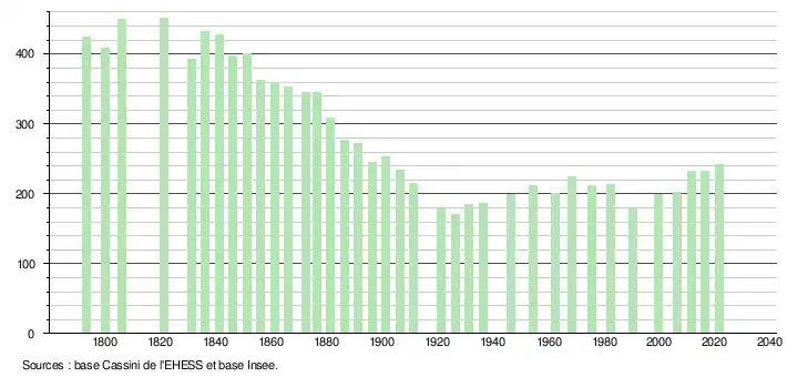 L'évolution du nombre d'habitants est connue à travers les recensements de la population effectués dans la commune depuis 1793. Pour les communes de moins de 10 000 habitants, une enquête de recensement portant sur toute la population est réalisée tous les cinq ans, les populations légales des années intermédiaires étant quant à elles estimées par interpolation ou extrapolation[28]. Pour la commune, le premier recensement exhaustif entrant dans le cadre du nouveau dispositif a été réalisé en 2006[29].