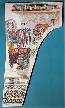 David avec ses attributs royaux, assis sur son trône et jouant de la lyre devant un bestiaire transpercé par son jeu - Mosaïque de la synagogue de Gaza, 508 ap. J.-C.