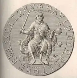 En avril ou mai de la même année, David est couronné roi d'Écosse (en gaélique : rí(gh) Alban ; en latin : rex Scottorum)[38] à Scone. Selon des sources écossaises et irlandaises postérieures, la cérémonie du couronnement est une série de rites traditionnels élaborés[39], qui demeurent mal vus dans le monde anglo-normand du fait de leurs éléments non-chrétiens[40]. Ailred de Rievaulx, ami et ancien membre de la cour de David, rapporte que ce dernier, malgré ses réticences « a tellement arboré ces actes d'hommage que la nation écossaise lui offrait […] qu'il fut difficilement obligé par les évêques à [recevoir les hommages] »[41]. En fait, pour Michael Lynch et Richard Oram, David n'a à l'origine que très peu de liens avec la culture et la société écossaise[42],[43], car il a passé une bonne partie de son enfance à la cour du roi d'Angleterre. Toutefois, les deux historiens sont d'accord sur le fait qu'il s'est fortement « regaélisé » au cours de son règne[44],[45].