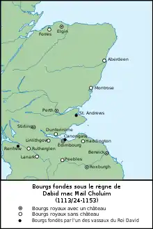 L'évêché de Glasgow est plus vraisemblablement restauré qu'entièrement recréé[98]. David y nomme son chapelain français Jean[99], et lui octroie l'ensemble des terres de sa principauté de Cumbria, à l'exception de celles situées à l'est et déjà gouvernées par l'évêque de Saint Andrews[Note 7]. David est un peu intervenu pour forcer les « évêchés » semi-monastiques de Brechin, Dunkeld, Mortlach (Aberdeen) et Dunblane à devenir totalement épiscopaux et s'intégrer dans le système national des diocèses[100].