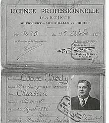 Source : Licence professionnelle d'artiste no 275 délivrée le 18/10/1933 par le syndicat des artistes de concerts, music-halls et cirques, 61 Faubourg Saint-Martin, Paris 10e, en tant que chanteur comique comédien .