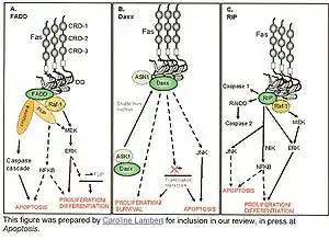 - La voie de FADD implique un processus plus rapide et dépendant des caspases. La voie de Daxx, elle, active une voie plus lente qui n'intervient pas directement sur les caspases[14]. En absence de FADD dans les lignées cellulaires, Daxx ne peut compenser ce manque[11]. Il a été établi que Daxx interagit directement avec la protéine ASK1 (apoptosis signal-regulating kinase-1) avant d'activer la protéine JNK.