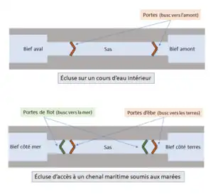 Dans le cas des écluses de ce complexe, la différence de hauteur d’eau entre les deux biefs varie et s’inverse en fonction des marées. Pour en tenir compte, chaque écluse est donc équipée de quatre portes busquées, adossées respectivement deux à deux à chaque extrémité du sas, comme on peut le voir sur les photographies et le schéma illustrant l’article. Chacun de ces deux ensembles comporte une porte dont le busc est dirigé vers les terres (porte d’èbe[9]) et une porte dont le busc est dirigé vers la mer (porte de flot[10]). Le premier type de porte permet de maintenir le niveau d’eau souhaité côté canal lorsque la marée est basse, et le second d’éviter un envahissement du canal par la mer à marée haute.