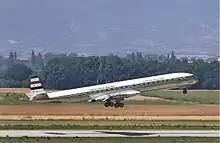 Le Comet 4 réalise son premier vol le , reçoit son certificat de navigabilité le , et la première livraison a lieu le lendemain, à la BOAC[116],[120]. Le prix de base d'un Comet 4 neuf est d'environ 1 140 000 £, soit 22 550 000 £ de 2012[121],[122]. Le Comet 4 permet à la BOAC d'inaugurer les premiers vols réguliers transatlantiques en jet le , entre Londres et New York (bien que nécessitant encore un ravitaillement à l'aéroport international de Gander, à Terre-Neuve au Canada, lors des traversées vers l'ouest)[68]. Tandis que la BOAC profite de la publicité comme la première compagnie à effectuer des services transatlantiques en jet, à la fin du mois, la Pan American World Airways rivale exploite le Boeing 707 sur le même itinéraire[123] et, en 1960, également le Douglas DC-8. Les jets américains sont plus grands, plus rapides, ont une distance franchissable plus élevée et sont plus rentables à exploiter que le Comet[124]. Après l'analyse des structures de routes pour le Comet, la BOAC cherche un successeur et, en 1958, signe un accord avec Boeing pour acheter le 707[125].