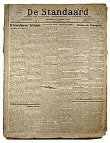 Le mercredi , le journal De Standaard paraît pour la première fois dans une édition de 4 000 exemplaires[1] avec le slogan « Vlamingen spreekt uw taal »[Note 1] à droite du titre[2]. Van Cauwelaert a écrit : « Un seul mot d'introduction, car nous sommes censés travailler » et « Nous-mêmes nous nous battrons pour faire de De Standaard l'un des organes les plus importants de la presse belge en très peu de temps »[3]. Dès le début, le journal a été sous-titré Le journal des intérêts politiques, sociaux et économiques. Les premières éditions, en grand format, mesure 45 × 60 centimètres. Le journal avait 2 pages (une feuille) et coûtait 10 cents. Le grand format a été conservé (avec un petit ajustement à 41 × 58 centimètres) jusqu'en 2004. Cela fait de De Standaard littéralement l'un des plus grands journaux du monde depuis longtemps[4].