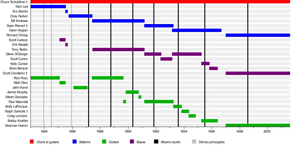 - Chuck Schuldiner – guitare (1983–2001), chant (1984–2001), basse (1987–1988)