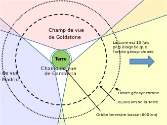 - Interférométrie à très longue base (VLBI)[6] : le but est de connaître avec précision la position d'un objet fixe dans le ciel, comme les quasars, les galaxies ou les étoiles lointaines. La localisation d'une sonde spatiale pourra ensuite se faire par rapport à cet objet plutôt que par rapport à la Terre : cela permet de réduire les incertitudes liées à la rotation de la Terre et aux dégradations du signal sur le trajet. Cette technique de localisation est très utilisée et est appelée Delta Differential One-way Ranging ou Delta VLBI[5].