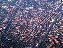 Delft est principalement connue pour son centre-ville historique, le quartier nommé (nl) Binnenstad. Parallèles, et à peu près dans la direction nord-sud, coulent les canaux (nl) Oude Delft et Nieuwe Delft. Ce dernier est mieux connu sous les noms successifs de (nl) Lange Geer, Koornmarkt, Wijnhaven, Hippolytusbuurt et Voorstraat, qui correspondent aux différentes sections des rues qui longe le canal (nl) Nieuwe Delft.