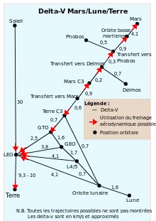 | À la surface de Mars | L'attraction de Mars | 5,0 km/s | À la surface de Mars | L'attraction du Soleil | 34,1 km/s | |
