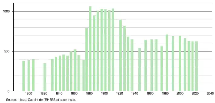 L'évolution du nombre d'habitants est connue à travers les recensements de la population effectués dans la commune depuis 1793. Pour les communes de moins de 10 000 habitants, une enquête de recensement portant sur toute la population est réalisée tous les cinq ans, les populations légales des années intermédiaires étant quant à elles estimées par interpolation ou extrapolation[18]. Pour la commune, le premier recensement exhaustif entrant dans le cadre du nouveau dispositif a été réalisé en 2006[19].