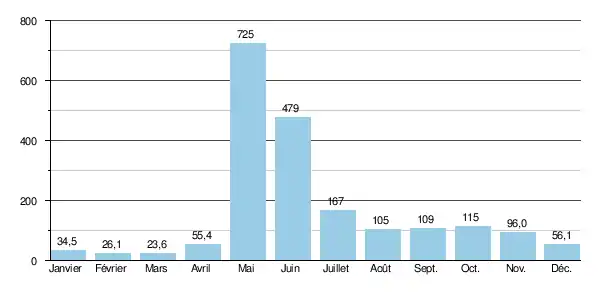 Le débit moyen mensuel observé en mars (minimum d'étiage) est de 23,6 m3/s, soit plus ou moins 3 % du débit moyen du mois de mai (725 m3/s), ce qui souligne l'amplitude très élevée des variations saisonnières. Sur la durée d'observation de 15 ans, le débit mensuel minimal a été de 14,7 m3/s en , tandis que le débit mensuel maximal s'élevait à 1 280 m3/s en .