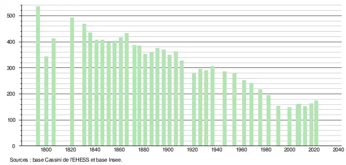 L'évolution du nombre d'habitants est connue à travers les recensements de la population effectués dans la commune depuis 1793. Pour les communes de moins de 10 000 habitants, une enquête de recensement portant sur toute la population est réalisée tous les cinq ans, les populations légales des années intermédiaires étant quant à elles estimées par interpolation ou extrapolation[16]. Pour la commune, le premier recensement exhaustif entrant dans le cadre du nouveau dispositif a été réalisé en 2007[17].