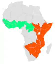 - en Éthiopie, en Érythrée, à Djibouti, en Somalie, au Kenya, en Ouganda, en Tanzanie, au Gabon en République démocratique du Congo et au Congo Brazzaville ;