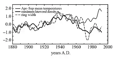 - la densité maximale du bois final (ou MXD pour « maximum latewood density ») se montre encore plus intéressante que la simple largeur des cernes. Elle a permis de reconstituer de nombreux climats locaux depuis des siècles et jusqu'à milliers d’années.