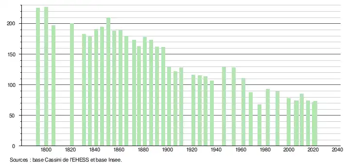 L'évolution du nombre d'habitants est connue à travers les recensements de la population effectués dans la commune depuis 1793. Pour les communes de moins de 10 000 habitants, une enquête de recensement portant sur toute la population est réalisée tous les cinq ans, les populations légales des années intermédiaires étant quant à elles estimées par interpolation ou extrapolation[16]. Pour la commune, le premier recensement exhaustif entrant dans le cadre du nouveau dispositif a été réalisé en 2005[17].