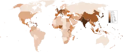 Les pays les plus densément peuplés du monde sont des cités-États : Monaco (16 923 hab./km2), Singapour (7 148 hab./km2) et le Vatican (1 877 hab./km2)[3]. En excluant les États d'une taille inférieure à 1 000 km2, le plus densément peuplé est le Bangladesh, où, 147 millions de personnes vivent dans une zone hautement agricole autour de l'embouchure du Gange, avec une densité de population de plus de 1 000 habitants par km2.