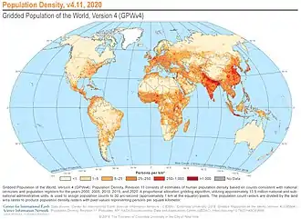 Elle est fréquemment exprimée en personnes par kilomètre carré ou par hectare et s'obtient en divisant le nombre de personnes par la surface considérée mesurée en kilomètres carrés ou en hectares[1]. Dans la pratique, on peut calculer ceci pour une ville, une agglomération, un pays ou le monde entier[2].