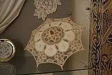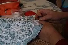 - l'ouvrage terminé, il est soit pris en l'état, soit monté sur un tissu[1]. La production était essentiellement destinée à la décoration d’ameublement : rideaux, parures de lits, services de table, nappes et napperons. Mais aussi des parures de vestimentaires : lingeries féminines, manteaux, mouchoirs, etc.