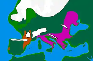 Le pergélisol couvrait l'Europe au sud de la calotte glaciaire, jusqu'à l'actuel Szeged, dans le sud de la Hongrie. La glace recouvrait toute l'Islande[28]. La glace a couvert également l'Irlande et presque tout le Pays de Galles, la limite sud de la calotte glaciaire s'étendant approximativement de l'emplacement actuel de Cardiff au nord-nord-est jusqu'à Middlesbrough, puis à travers le Doggerland jusqu'au Danemark[29].