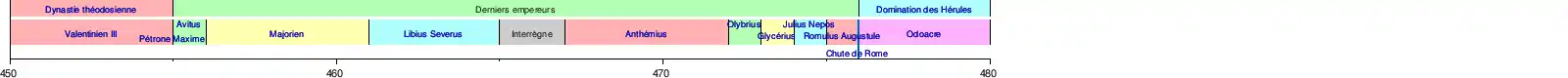 La liste révèle l'instabilité du pouvoir impérial à compter de 455 car en l'espace de 20 ans, 9 empereurs sont montés sur le trône. Durant la période d'instabilité du pouvoir, un homme, Ricimer, tira les ficelles du pouvoir de 455 jusqu'à sa mort en 472. Valentinien III, assassiné en 455, annonce la fin de la dynastie théodosienne en Occident et de la succession des derniers empereurs :