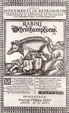 « Ici à Wittenberg[34], dans notre église paroissiale, il y a une truie sculptée dans la pierre, sous laquelle sont étendus des jeunes cochons et des Juifs qui sont en train de téter, et derrière la truie se tient un rabbin qui soulève la patte droite de la truie, se dresse derrière la truie, se penche et regarde avec grand effort le Talmud sous la truie, comme s'il voulait lire et voir quelque chose de très difficile et d'exceptionnel ; il n'y a aucun doute, ils ont reçu leur Chem Hamphoras de cet endroit. »