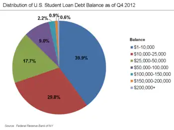 Il y avait environ 37 millions de personnes ayant des prêts étudiants non remboursés en 2013. Selon la Réserve fédérale des États-Unis, l'encours de la dette étudiante aux États-unis se situe entre 902 G$ et 1 T$[22]. Pour le 1er trimestre 2012, l'étudiant moyen porte une dette de 24 301 $. près d'un quart des emprunteurs doivent plus de 28 000 $ ; 10 % des emprunteurs doivent plus de 54 000 $, 3 % une somme supérieure à 100 000 $; moins de 1 % (167 000 personnes) doivent plus de 200 000 $. En 2010, pour la première fois, la dette étudiante a dépassé celle des cartes de crédit (de type crédit à la consommation), et en 2011, la dette étudiante a dépassé les prêts automobiles (les deux étant en la baisse)[23]. Selon Mark Kantrowitz, de FinAid.org, la dette étudiante augmente de 3 000 $ par seconde. Selon un rapport de The Institute for College Access and Success, la dette moyenne des diplômés en 2013 dépasse 30 000 $ dans 6 États, et est inférieure à 20 000 $ dans un seul[24]. Les données de la Réserve fédérale pour le quatrième trimestre 2014 ont trouvé qu'un prêt étudiant sur 9 n'est pas remboursé[25]. En 2015, plus de la moitié des remboursements sont décalés, en retard de payement, ou en défaut[26]. Le problème de la dette étudiante augmente les inégalités de richesse[27].