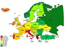 En 2020, la dette des états de l'Union européenne s'élève à 12 078 milliards d'euros, soit 90,7 % du PIB total des 27 pays membres. Pour la seule zone euro, la dette s'élève à 11 108 milliards d'euros, soit 98,0 % du PIB total des 19 pays membres.