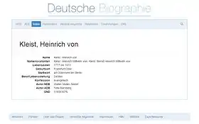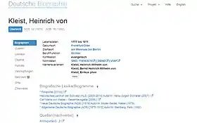 À la suite de la phase d'expansion de 2012 à 2014, "la présence en ligne étendue et mise à jour" de Deutsche Biographie est activée en décembre 2014 avec environ 268 000 entrées[3]. Entre autres choses, tous les noms sont comparés et liés au Gemeinsame Normdatei (GND).