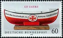 Timbre de la poste allemande montrant le Sammelschiffchen, le bateau de collecte des dons, fêtant en 1990 les 125 ans d'existence de la DGzRS