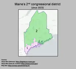 Les limites du district sont ouvertes à un réexamen à la lumière des changements de population révélés par le recensement décennal des États-Unis. Jusqu'en 2011, la Constitution du Maine prévoyait que l'État redistribuait les districts congressionnels sur la base des données du recensement tous les dix ans à partir de 1983, ce qui aurait signifié que l'État devait ensuite envisager un redécoupage en 2013. Cependant, une action en justice fédérale a été déposée en mars 2011 a conduit à exiger que le Maine accélère son processus de redécoupage[3]. Les législateurs de l'État du Maine ont approuvé de nouvelles limites le 27 septembre 2011[4].