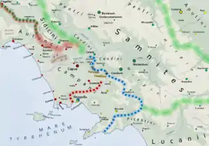 - Limite approximative des sphères d'influence romaine et samnite à la suite du traité de 354[N 1]