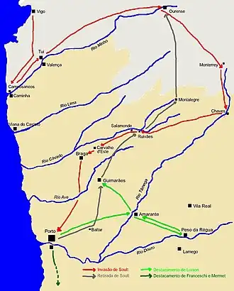 Les Portugais refusent les propositions de reddition faites par Soult. Le 28 mars 1809 débute donc la bataille de Porto. Une nouvelle fois, le manque d'efficacité des forces improvisées coûte cher aux Portugais. La défense ne résiste pas et la ville tombe aux mains des Français. L'affrontement se prolonge dans la ville autour des barricades successives levées dans chaque rue, mais en vain. Outre les atrocités perpétuées sur la population, l'épisode désastreux du pont de barques jeté sur le Douro, qui provoque des milliers de morts, reste dans les mémoires. Après l'occupation de Porto, Soult envoie des troupes au sud du Douro formées par la cavalerie de Franceschi et l'infanterie de Mermet.