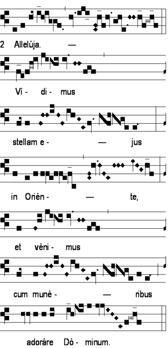 Dans l'exemple ci-contre (Vidimus stellam ejus de l'Epiphanie), la dernière incise pourrait être interprétée comme un premier mode classique, avec teneur sur fa et la, et retour sur le ré grave. C'est l'ensemble de la pièce qui montre que le sol joue un rôle de teneur, ce que l'on peut constater sur la finale de l'Alléluia et son mélisme, la syllabe accentuée de vidimus, celle de ejus à la ligne suivante: ces passages sont incompatibles avec la structure modale du premier mode. Ils justifient que les récitatifs de la dernière incise soient interprétés comme des récitatifs d'attente, par rapport à l'ambiance modale construite par le reste de la pièce.
