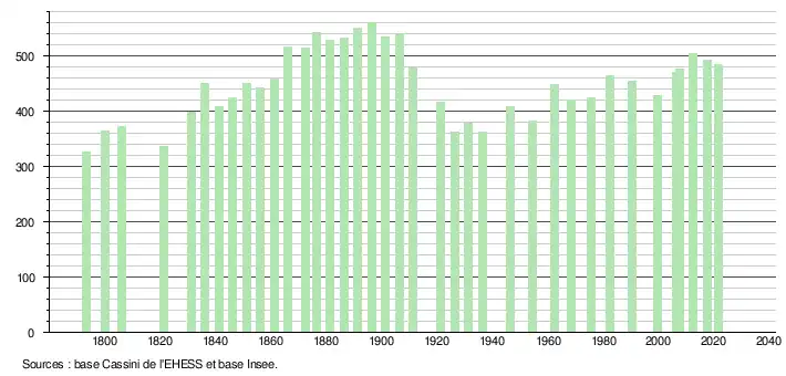 L'évolution du nombre d'habitants est connue à travers les recensements de la population effectués dans la commune depuis 1793. Pour les communes de moins de 10 000 habitants, une enquête de recensement portant sur toute la population est réalisée tous les cinq ans, les populations légales des années intermédiaires étant quant à elles estimées par interpolation ou extrapolation[14]. Pour la commune, le premier recensement exhaustif entrant dans le cadre du nouveau dispositif a été réalisé en 2007[15].