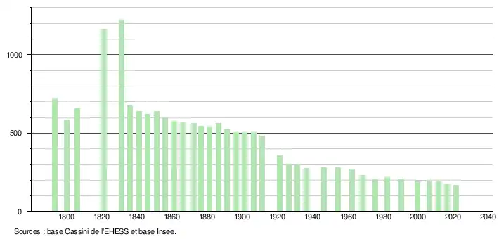 L'évolution du nombre d'habitants est connue à travers les recensements de la population effectués dans la commune depuis 1793. Pour les communes de moins de 10 000 habitants, une enquête de recensement portant sur toute la population est réalisée tous les cinq ans, les populations légales des années intermédiaires étant quant à elles estimées par interpolation ou extrapolation[15]. Pour la commune, le premier recensement exhaustif entrant dans le cadre du nouveau dispositif a été réalisé en 2006[16].