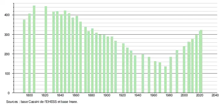 L'évolution du nombre d'habitants est connue à travers les recensements de la population effectués dans la commune depuis 1793. Pour les communes de moins de 10 000 habitants, une enquête de recensement portant sur toute la population est réalisée tous les cinq ans, les populations légales des années intermédiaires étant quant à elles estimées par interpolation ou extrapolation[44]. Pour la commune, le premier recensement exhaustif entrant dans le cadre du nouveau dispositif a été réalisé en 2005[45].